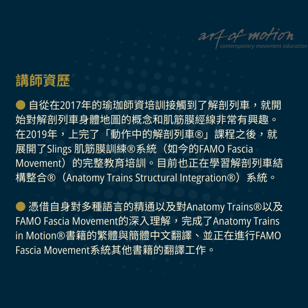 In Anatomy Trains in Motion, the integral anatomy of the myofascial meridians is explained in interactive lectures and experienced through body-minded movement applications. For clear comprehension of the structural and functional aspects, muscles and fascial structures are discussed individually and as part of the myofascial meridians.