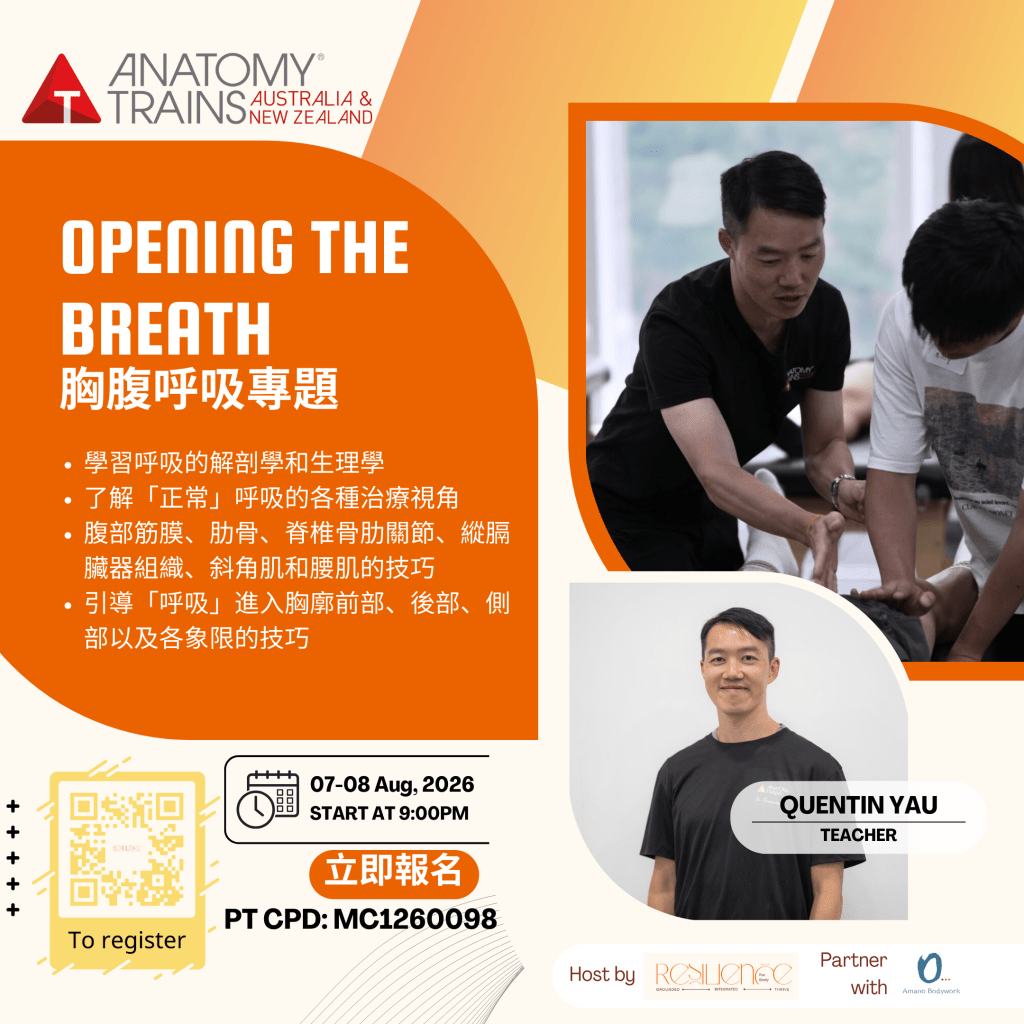 - 腹部筋膜、肋骨、脊椎骨肋關節和縱膈臟器組織、橫膈膜、斜角肌和腰肌的技巧